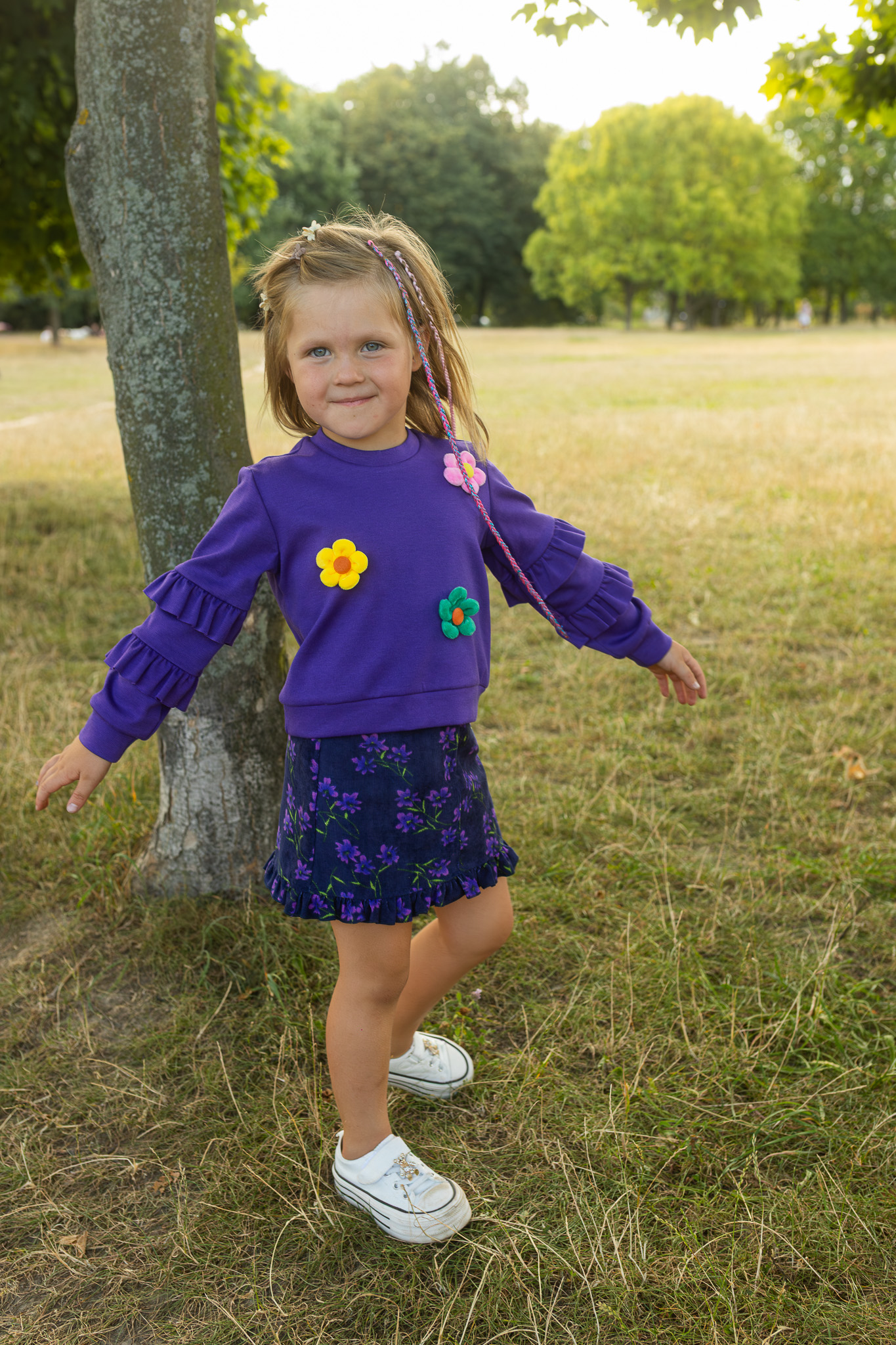 Bluza fioletowa z kwiatkami i falbankami na rękawkach