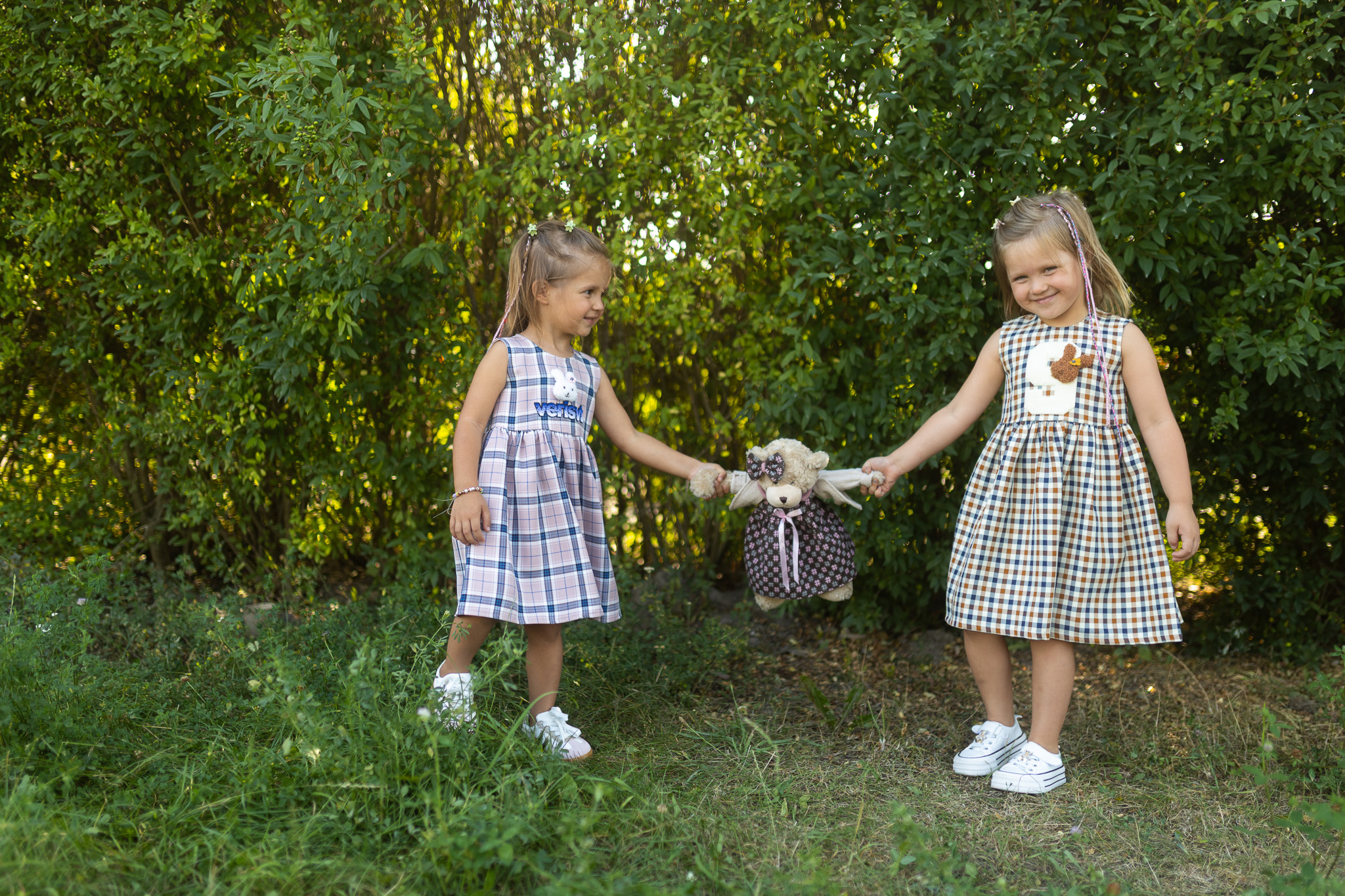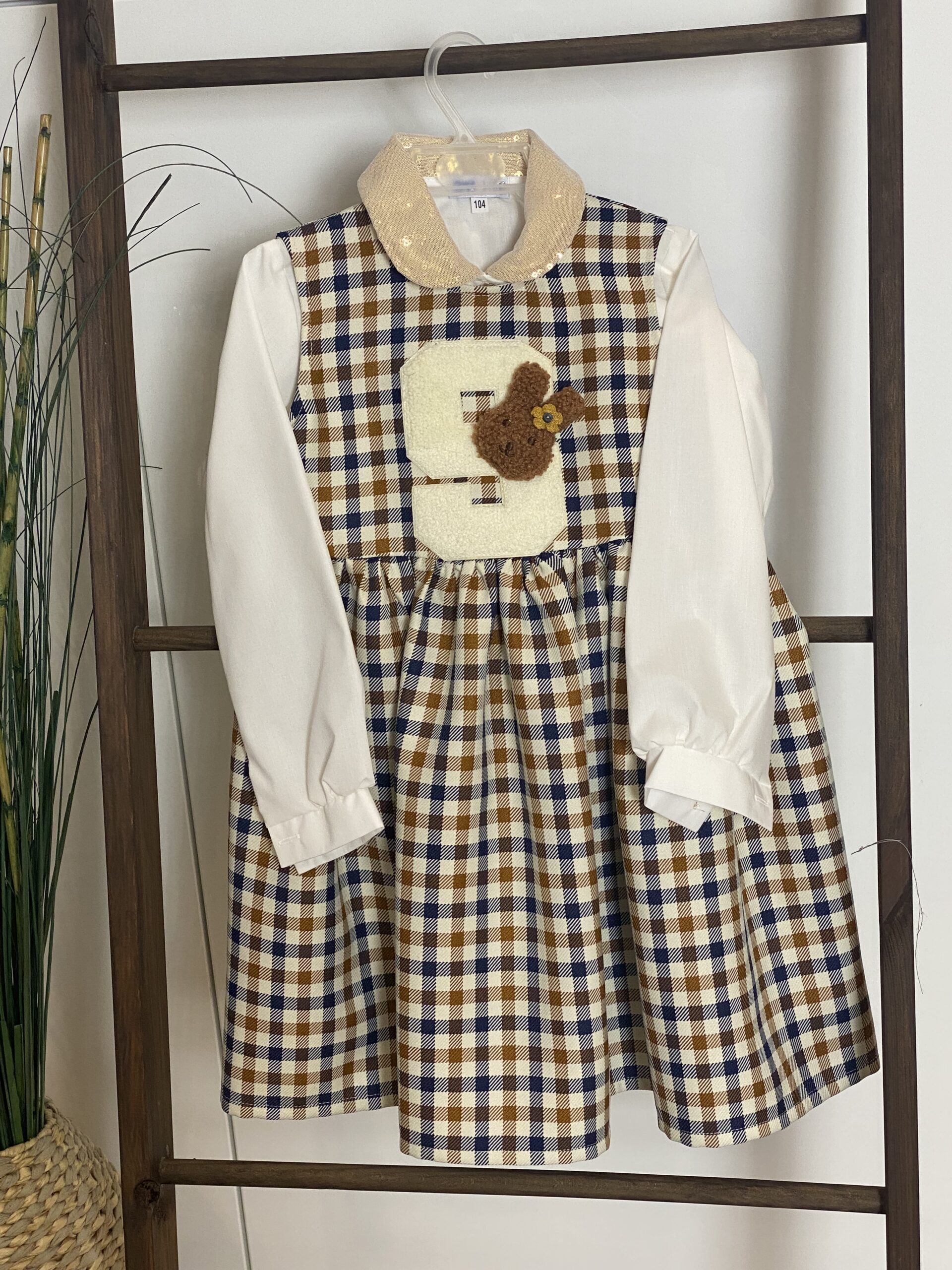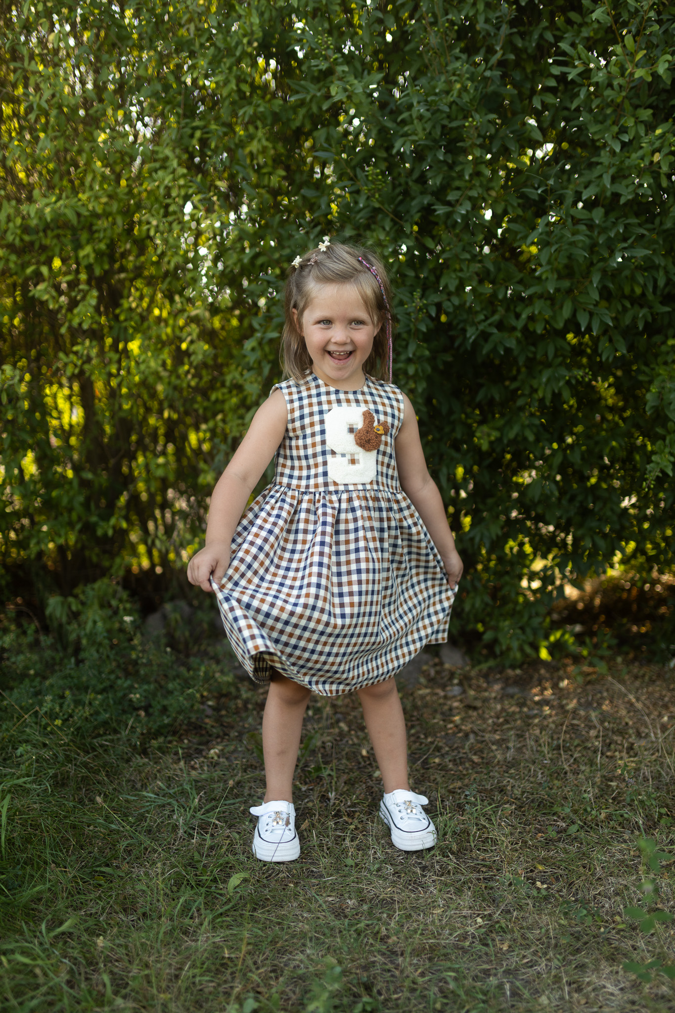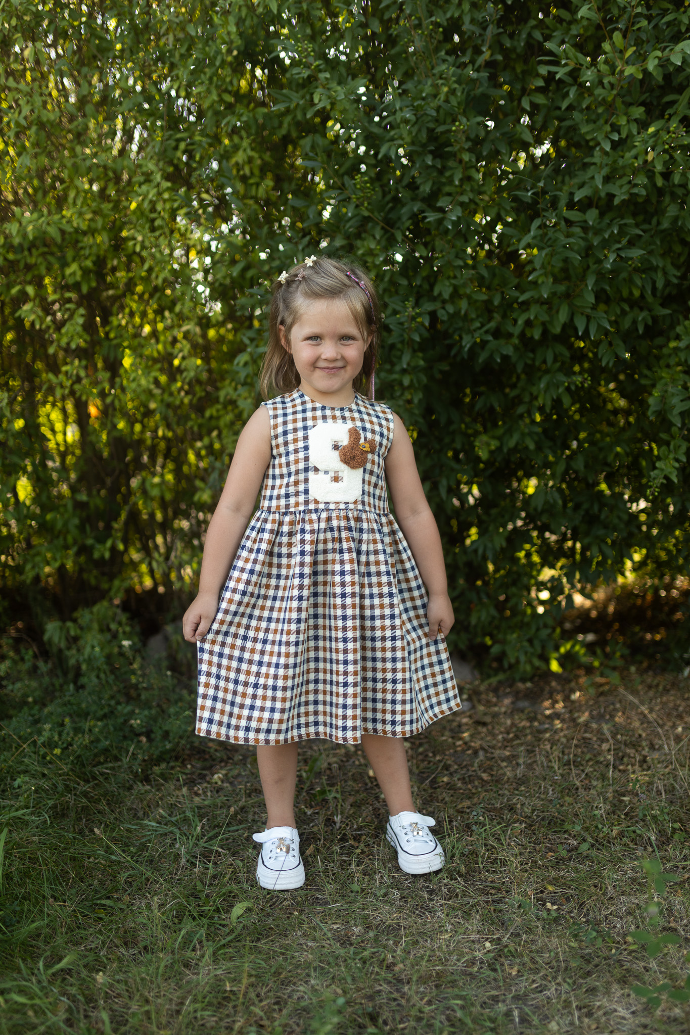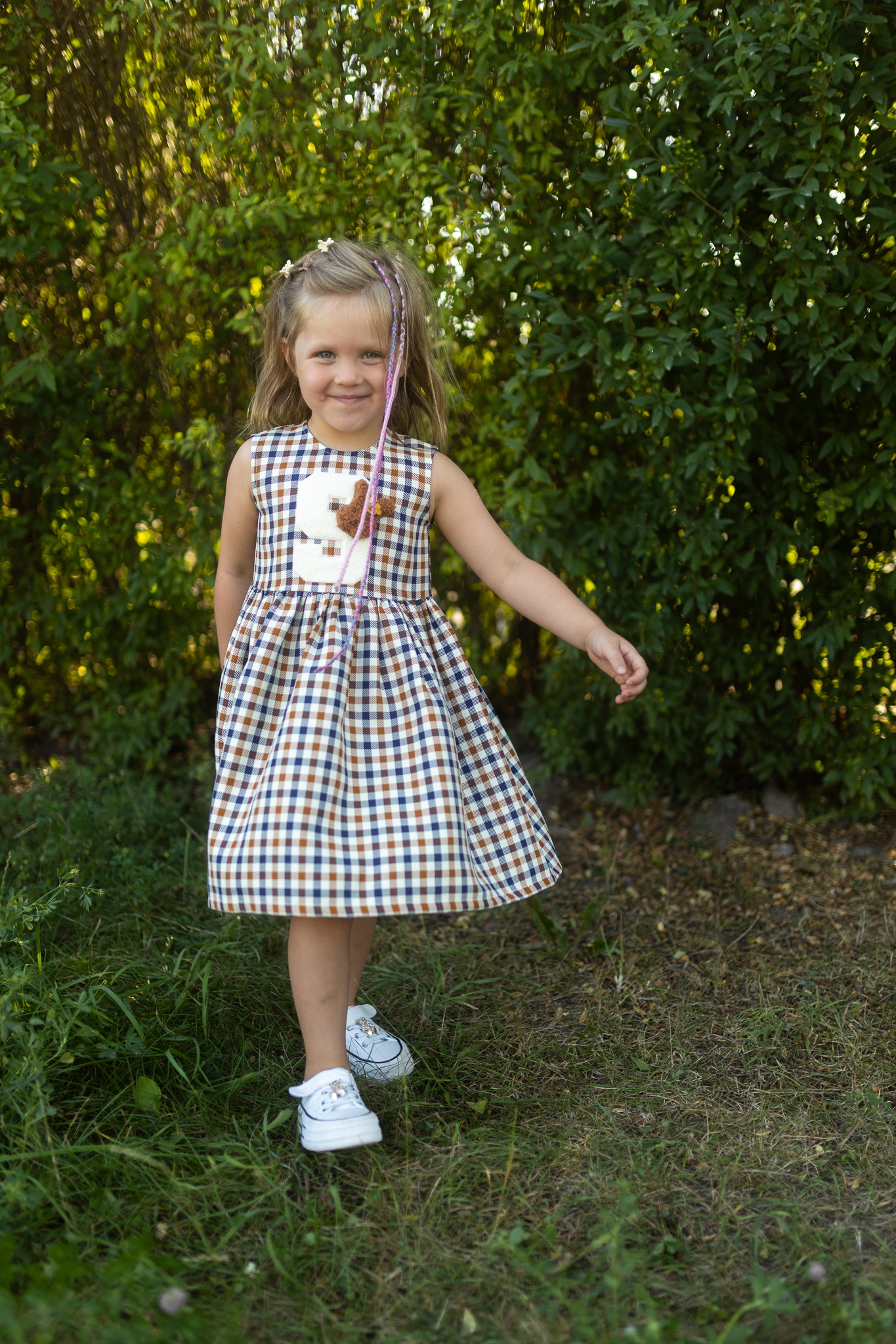 Sukienka bez rękawów w kratkę brązowo – granatową z brązowym króliczkiem.