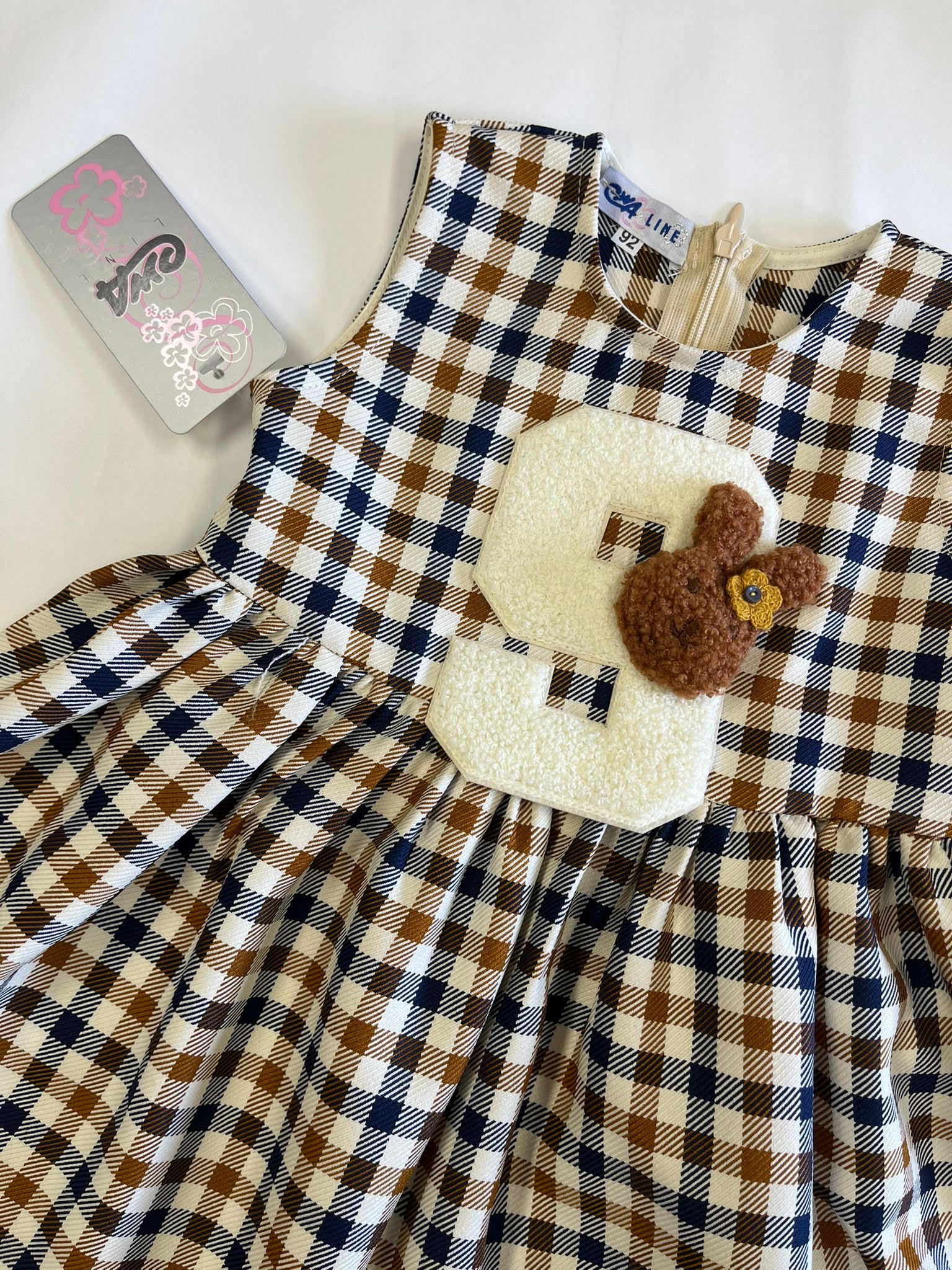 Sukienka bez rękawów w kratkę brązowo – granatową z brązowym króliczkiem