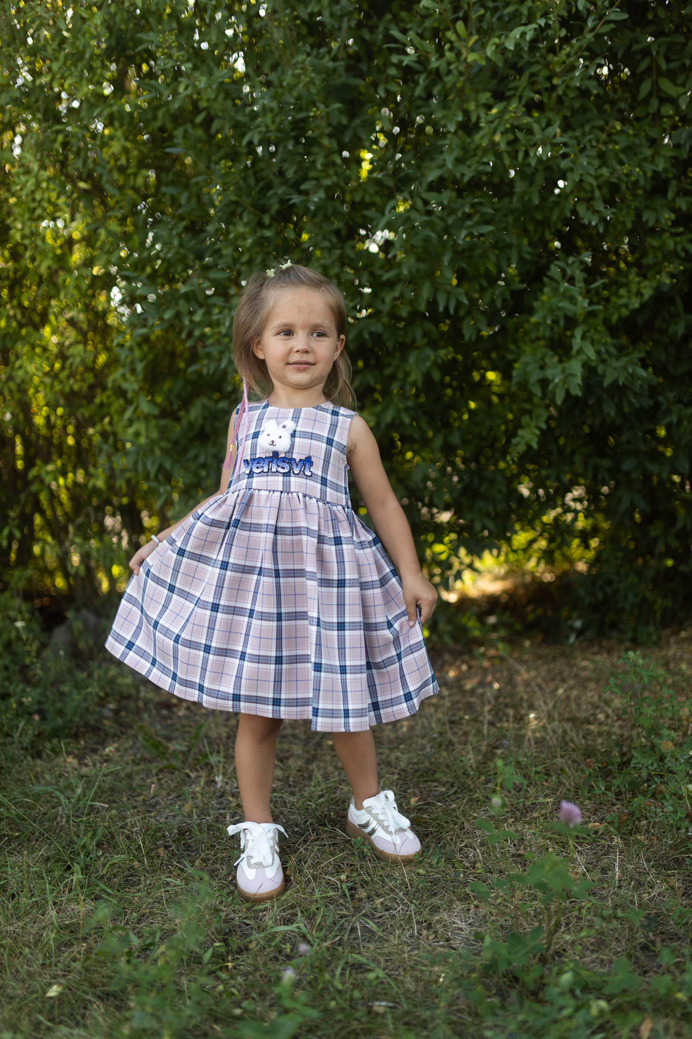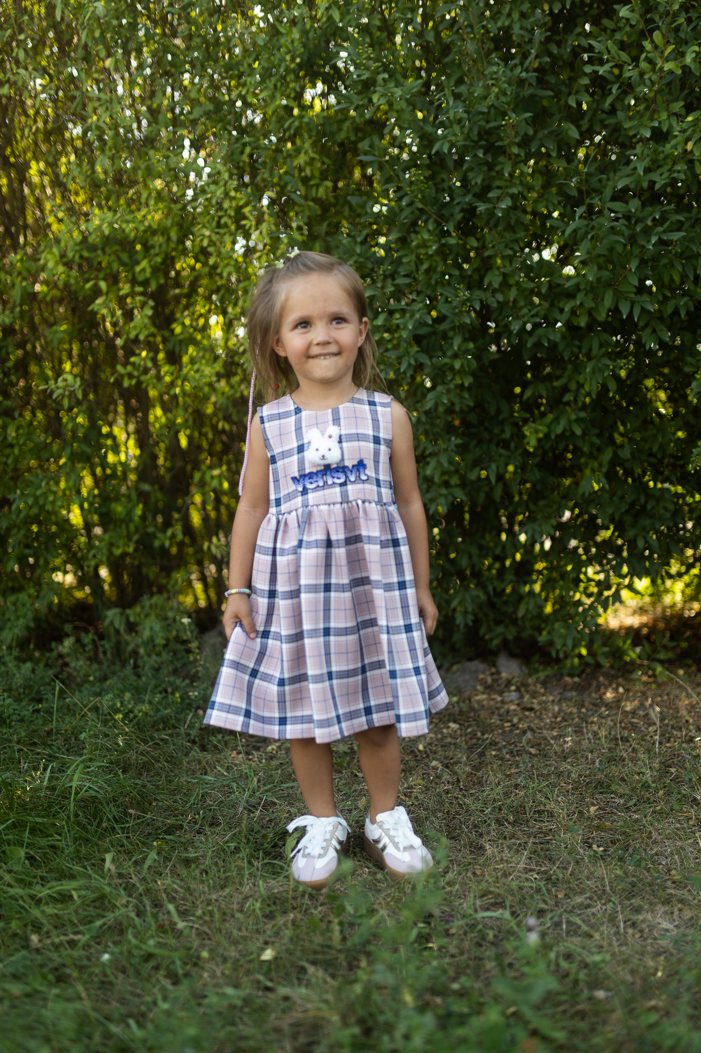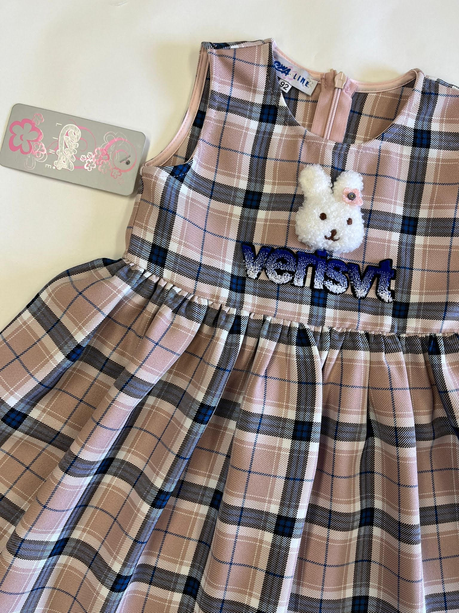 Sukienka bez rękawów w kratkę różowo – granatową z białym króliczkiem