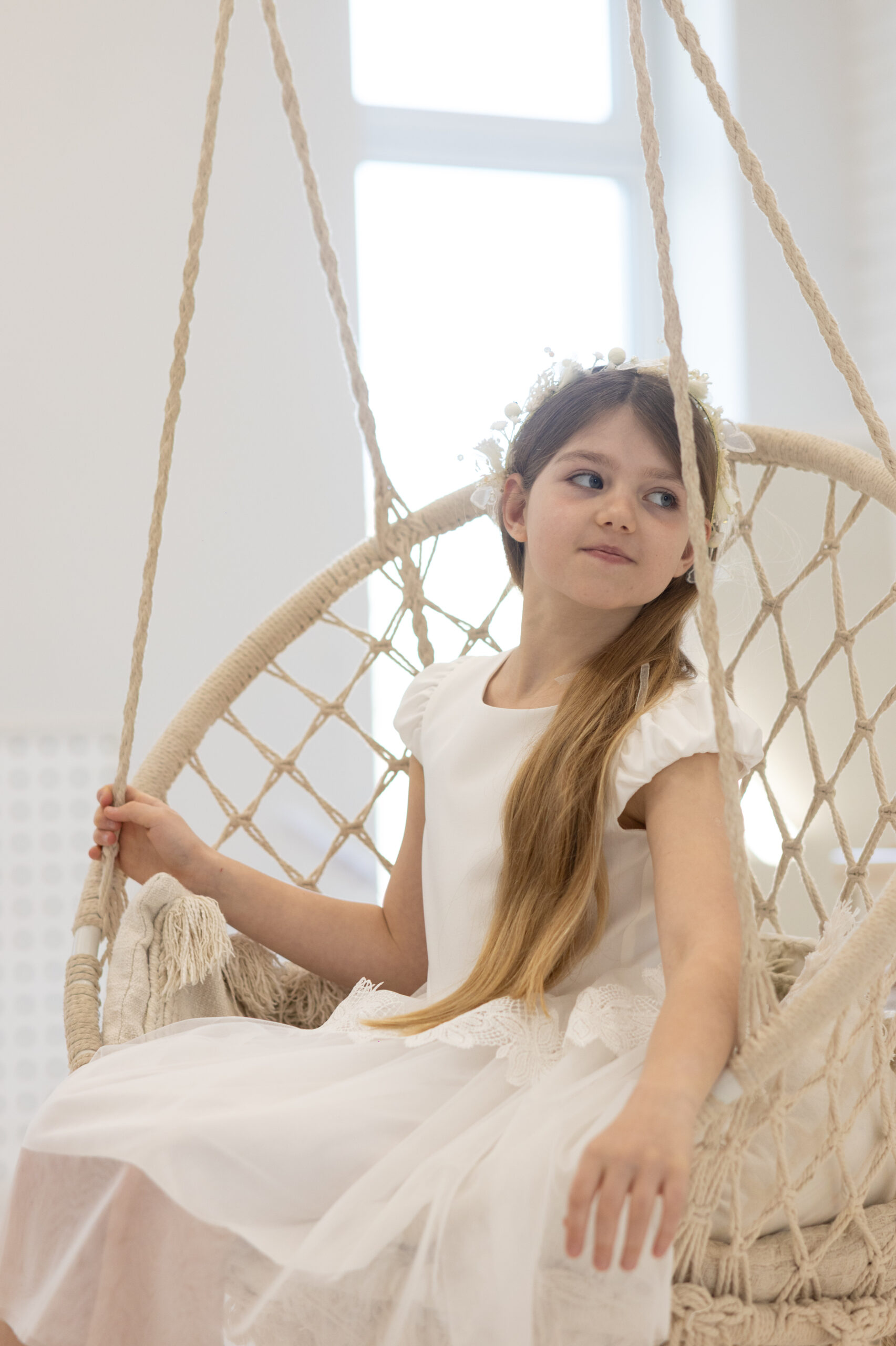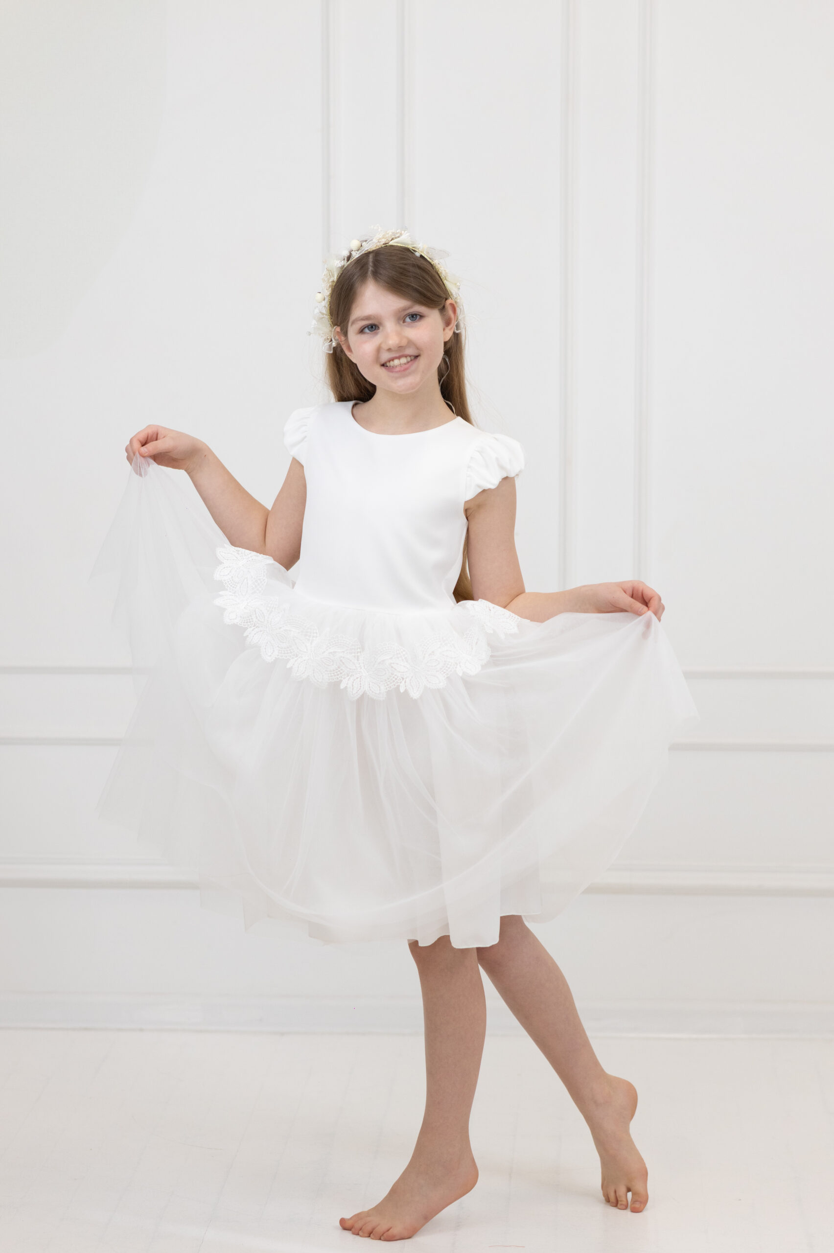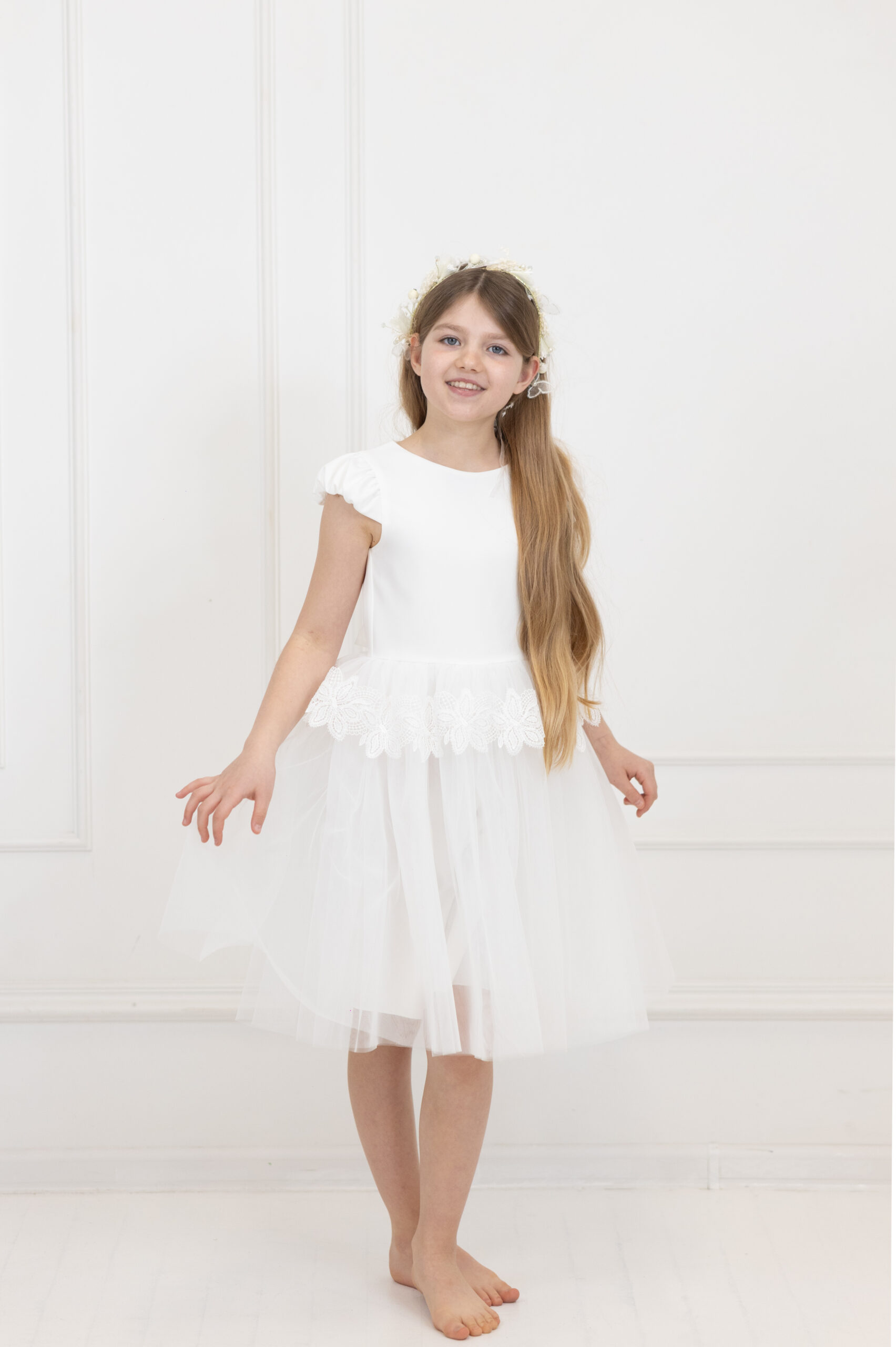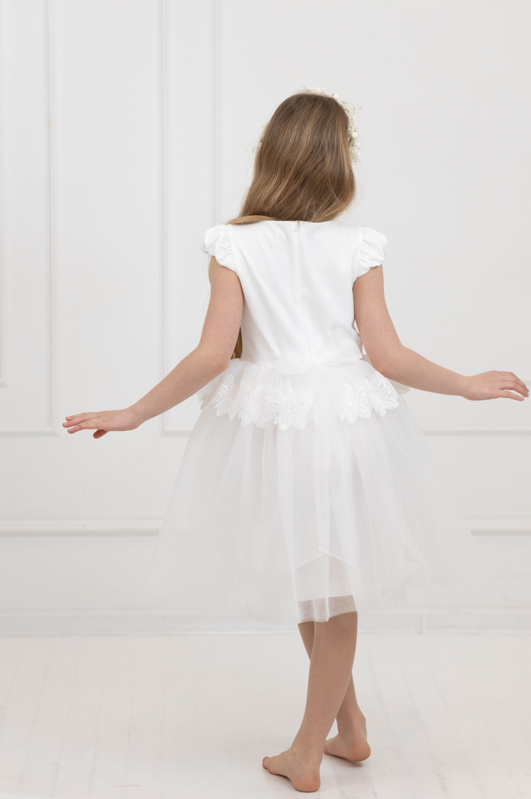 Sukienka écru z tiulową baskinką wykończoną delikatną gipiurą.