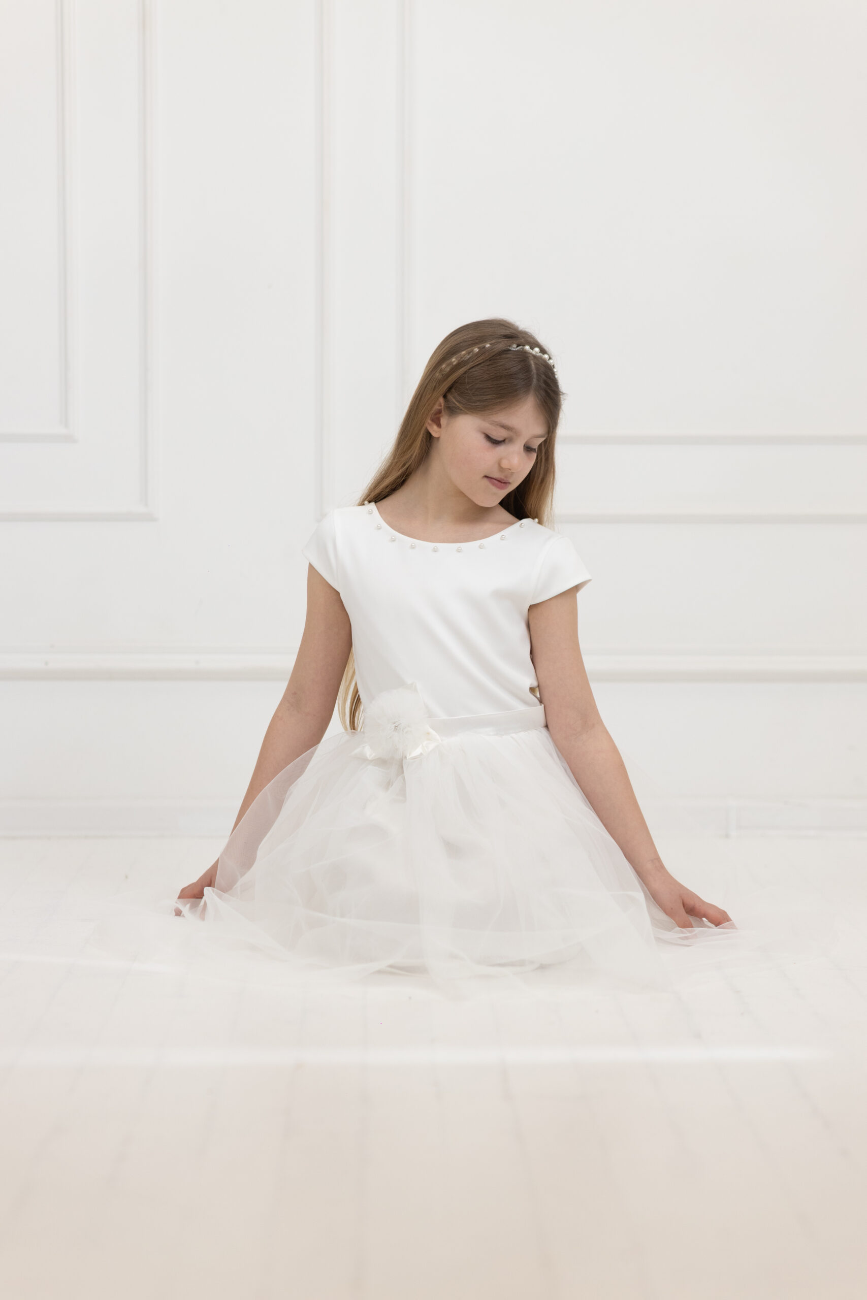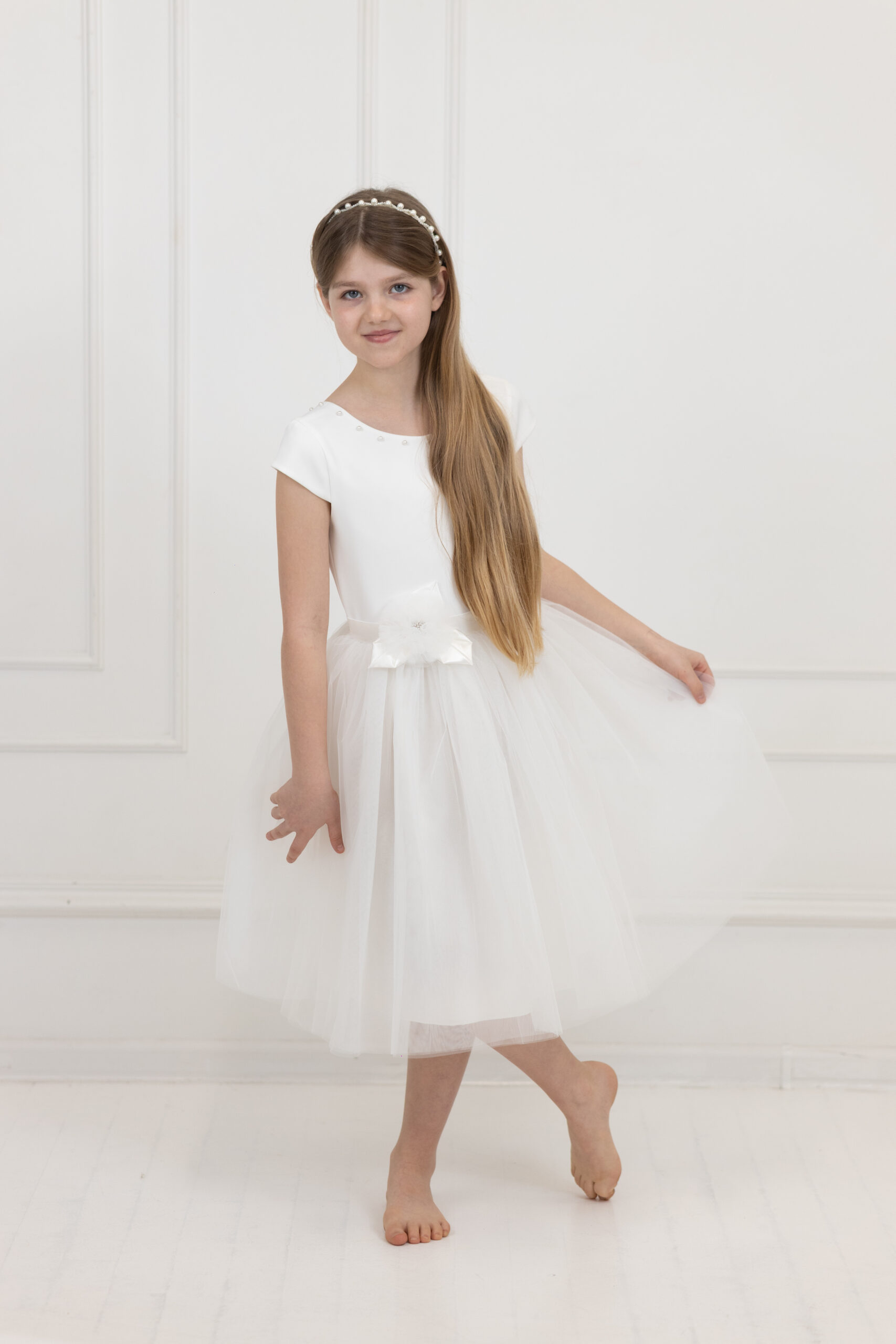 W pasie znajduje się satynowy pasek, wiązany z tyłu. Z przodu na pasku sukienka posiada delikatną dekorację tiulową w formie kwiatuszka.