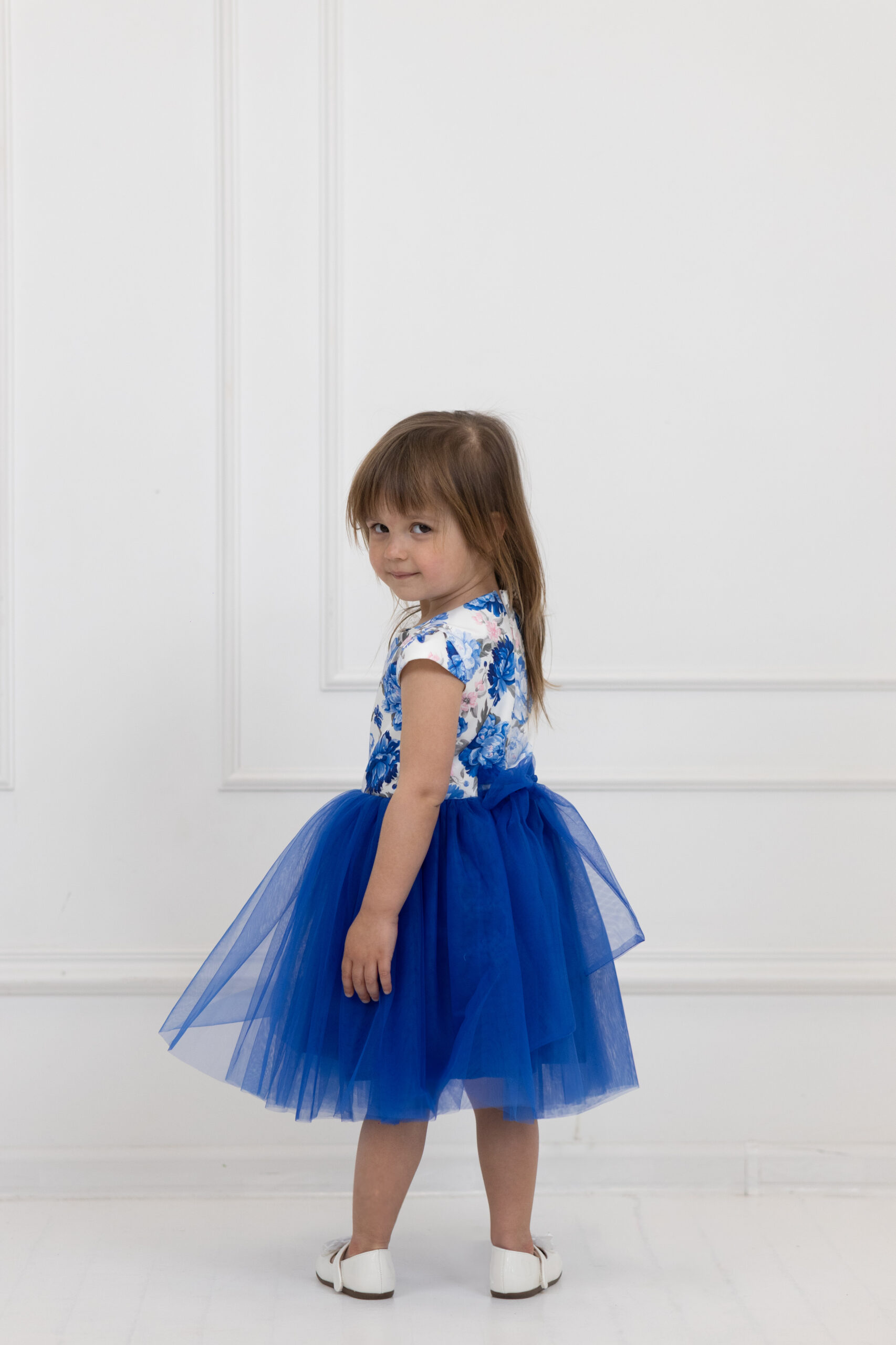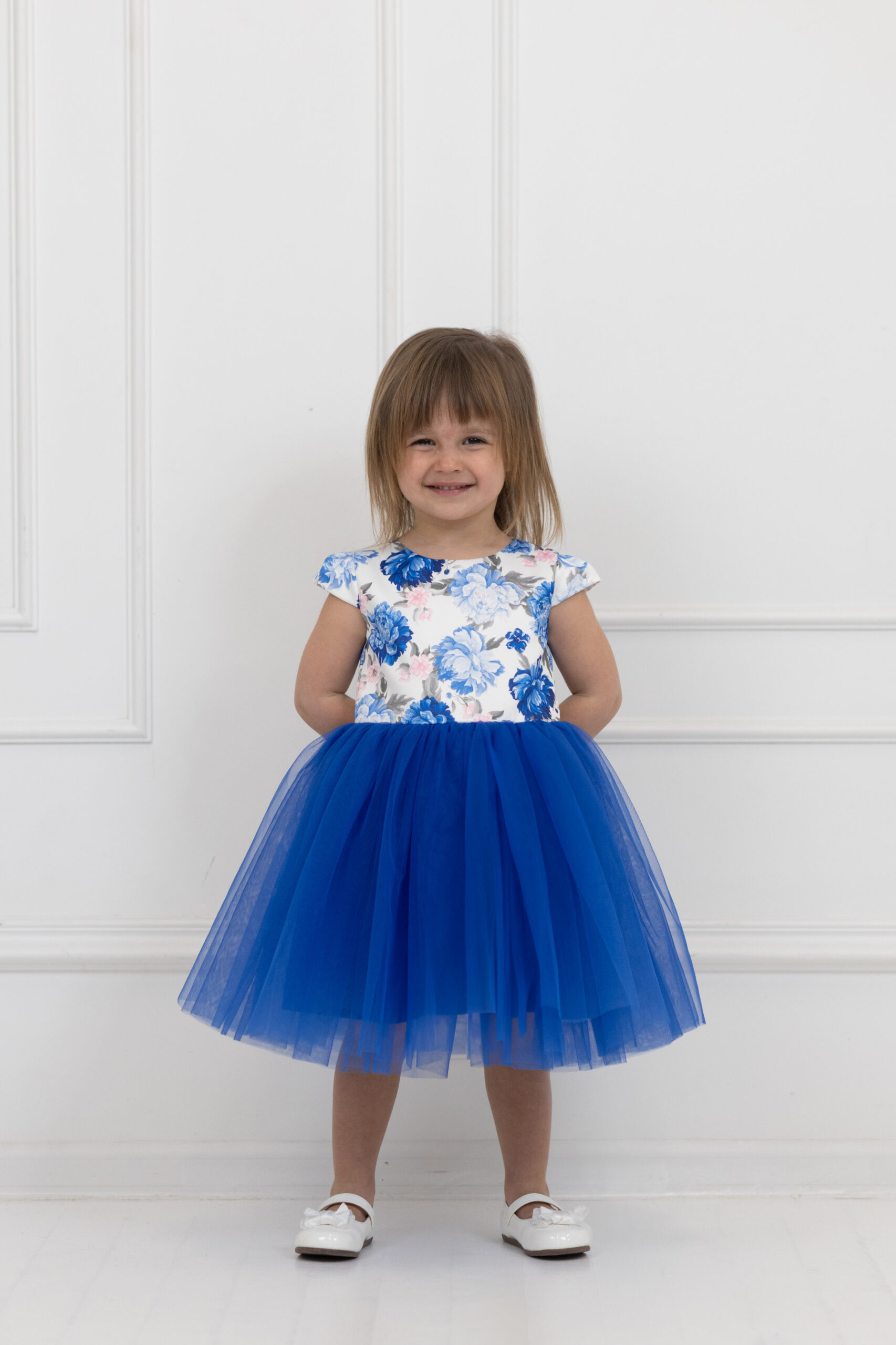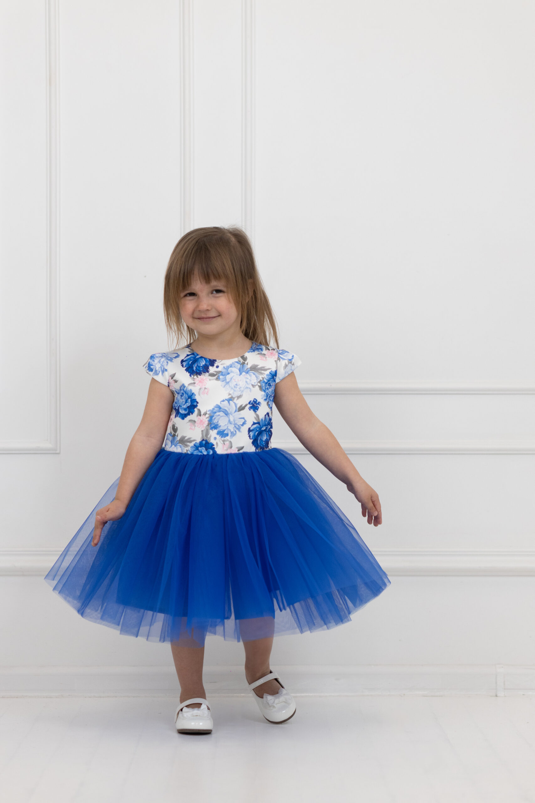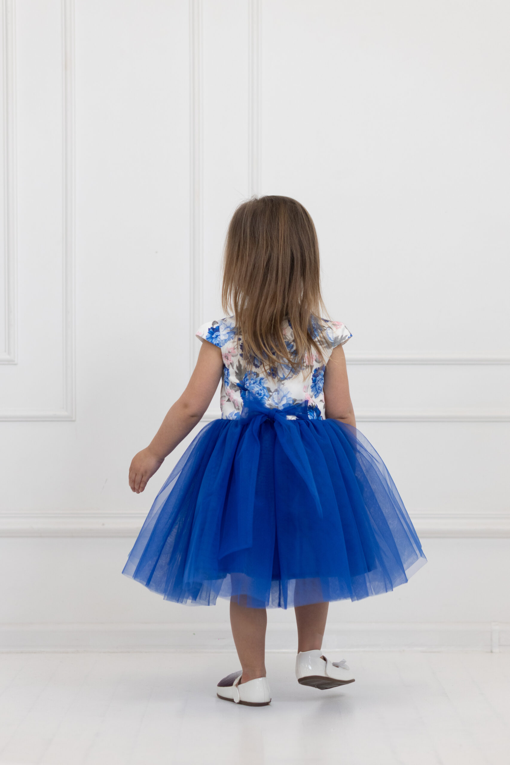 Góra tej sukienki wykonana jest z pięknej satyny w kwiaty, natomiast dół to chabrowy tiul.